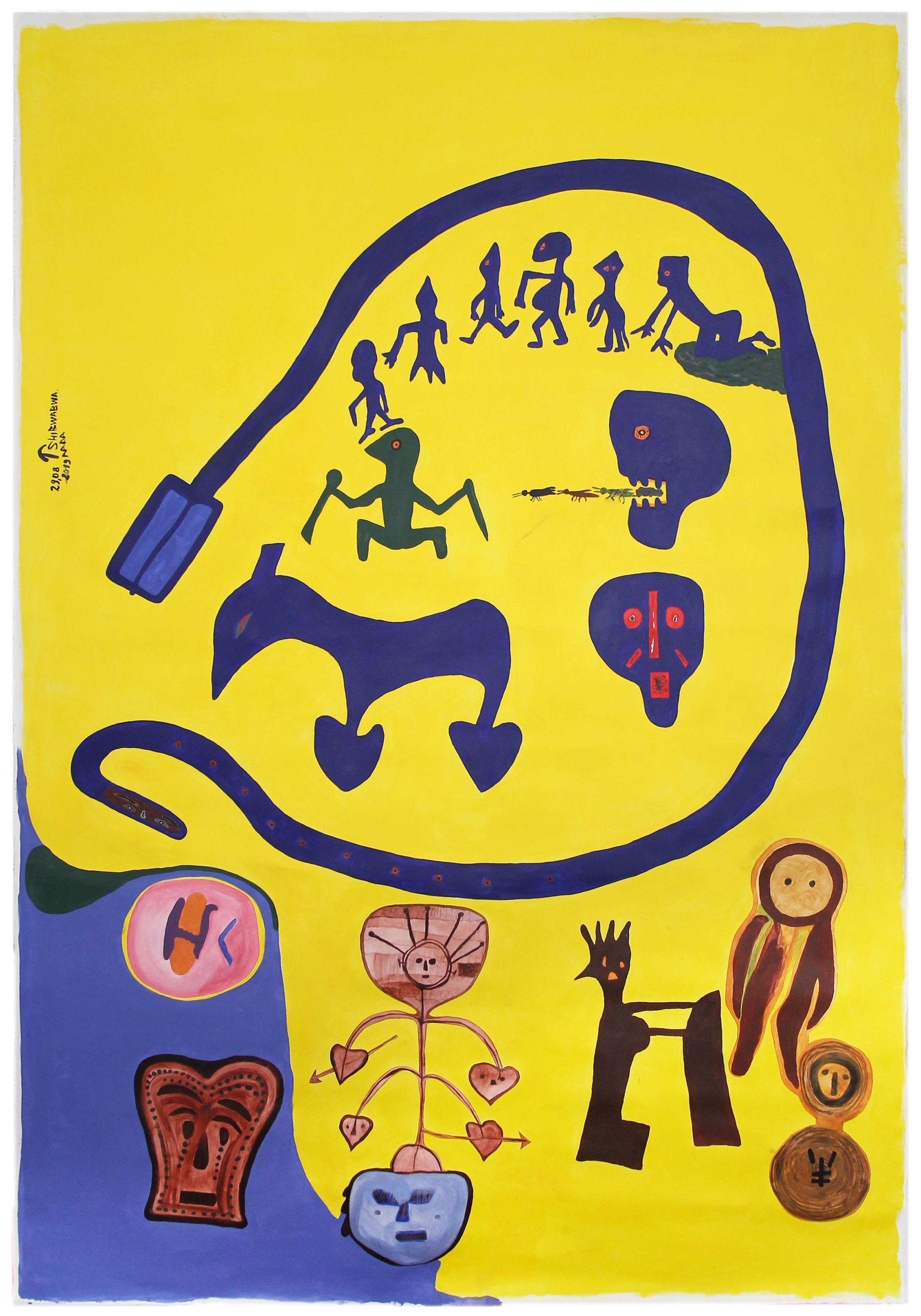 2 — Within an agglomeration of scattered houses, a pregnant women lies on the floor, birthing an infant, that pushes through her bleeding belly. From the infant’s mouth, flames rise, like a wordless scream. Below their separating unity, human shapes run left and right, while two flame-screaming, floating creatures chase them. Here, Nada Tshibwabwa reflects the sorrow emerging from contagious diseases, branching out, separating communities, confronting life with death and vice versa. A word game within the painting “Cont-A-Gieuses” (“contagese”, i.e. contagious) and “Conte-A-Jouer” (story about play) relates a double meaning. It refers to the sophisticated game “Nzanga,” played mainly by young women, where participants have to jump over a moving rope, demanding constant vigilance and fast reactivity.