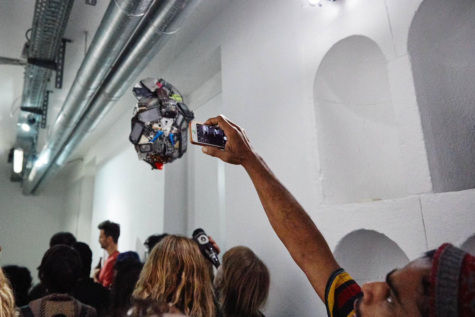 Working with discarded cell phones is part of a larger practice by Nada Tshibwabwa, which consists in using waste, that he finds during long walks in the streets of Kinshasa, or by visiting places, where debris is left en masse, as raw material for his artworks.